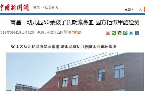 據(jù)中國新聞網(wǎng)報道, 9月17日,剛剛開學(xué)不久,由香港YM教育集團投資創(chuàng)辦的南昌經(jīng)開區(qū)奧克斯盛世華庭幼兒園遭到家長集體退學(xué)。家長們告訴記者,該幼兒園園開學(xué)一年來,已有50名幼兒頻繁流鼻血、咳嗽。家長們都懷疑是學(xué)校甲醛超標(biāo)引起的,但是園方卻拒不配合檢測,且處理態(tài)度十分惡劣。出于對孩子健康的擔(dān)憂,幾十名家長不得不讓孩子退學(xué)。
